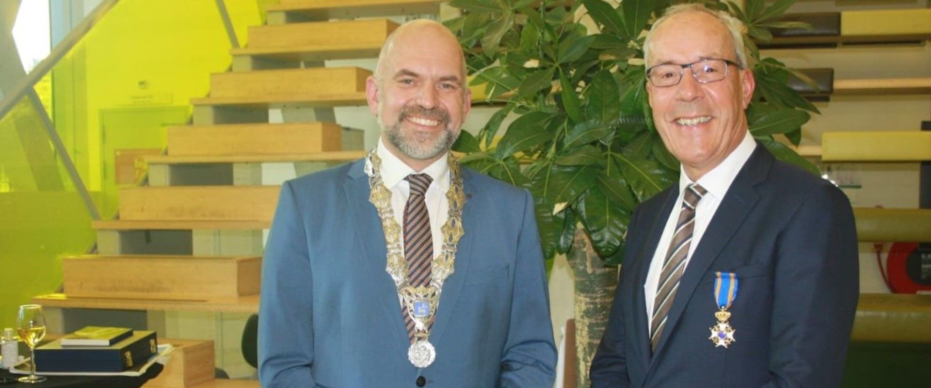 Ronald Does ontving de decoratie uit handen van locoburgemeester Jeroen Verwoort van de gemeente Velsen, tijdens een bijeenkomst ter ere van zijn emeritaat als hoogleraar Industriële Statistiek.